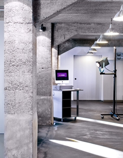 das bxb Grossraum-Fotostudio im Souterrain und hinten rechts der Besprechungsraum (Aquarium ; ) und mittig die Tuer zur Reproabteilung und links 2 weitere Behandlungs-Raeume - aus der (Labor)Kueche heraus fotografiert